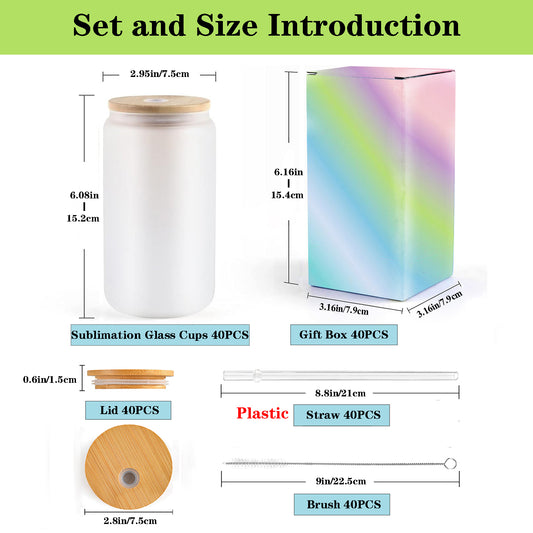 40Pack Frosted/Clear 16OZ Sublimation Glass Cups with Bamboo Lids and Straws